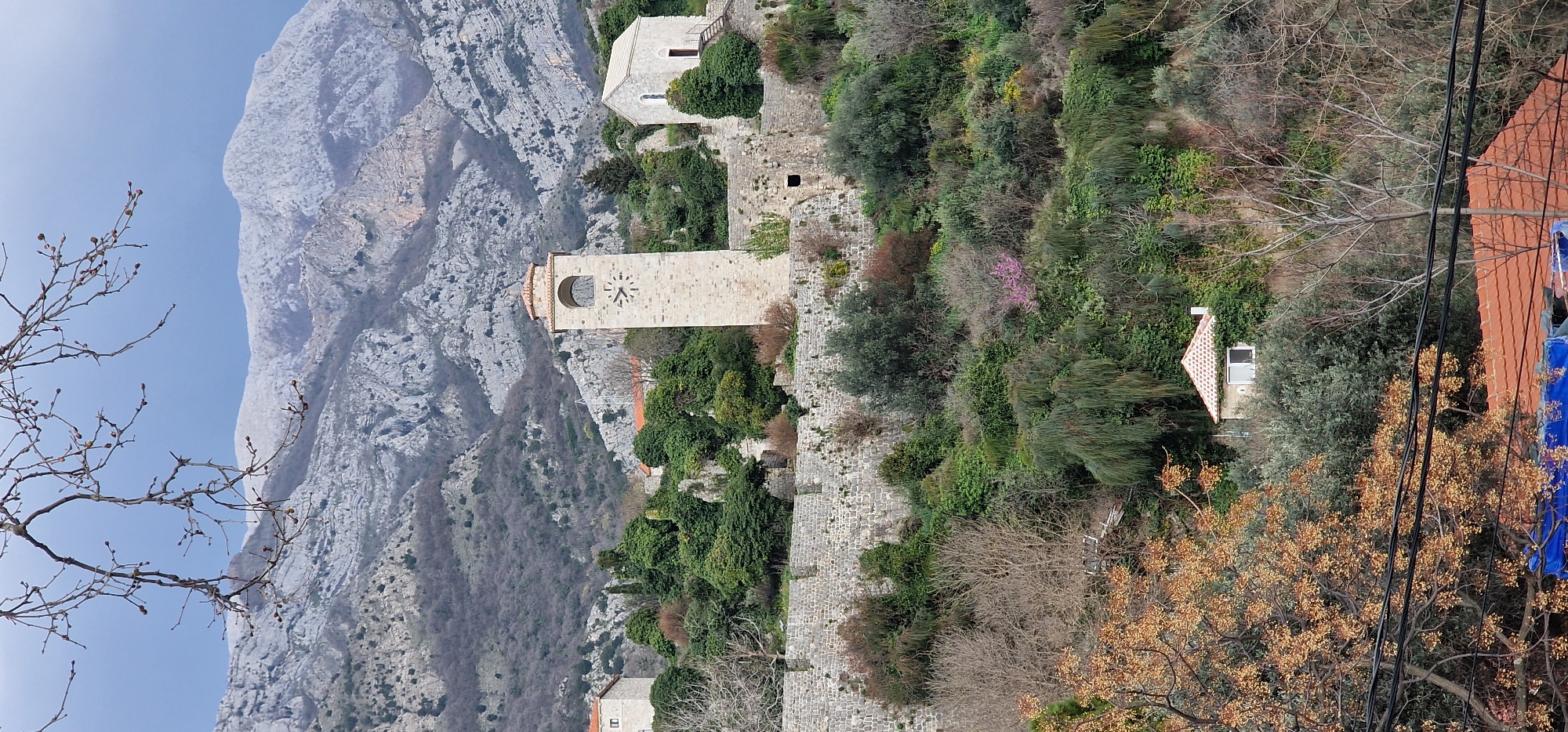 The image displays a panoramic view of the ancient city of Stari Bar, Montenegro, set against a backdrop of mountainous terrain. The upper third of the frame reveals rugged, predominantly gray mountains, with the highest peaks exhibiting patches of white, indicative of snow or frost, beneath a light blue sky. In the mid-ground, the primary focus is the stone fortification complex. A prominent, light-colored stone clock tower, topped with a conical terracotta-tiled roof, stands centrally. The tower features an arched opening near its apex and a circular clock face with Roman numerals, where the markings for III, VI, IX, and XII are discernable. To the immediate right of the clock tower, a smaller, single-story stone building with a gabled, light-colored roof and a dark doorway is visible, accessed by an external staircase. To the left, another multi-story stone building is partially visible. These structures are built upon extensive stone walls, forming the perimeter of the fortress, which descends along the hillside. The hillside below the fortress is densely vegetated, featuring a mix of deciduous trees, many appearing bare or with sparse brown/orange foliage, and various evergreen shrubs. A tree with small clusters of purple blossoms is discernible within this greenery. Further down the slope, a small, white house with a red-tiled roof and a single window is nestled among the trees. In the immediate foreground, dark, leafless tree branches, adorned with numerous small buds, extend across the upper-left quadrant, partially obscuring the sky and distant mountains. Below these branches, several dark utility lines run horizontally across the lower portion of the frame. At the very bottom edge, sections of a red-tiled roof and a blue tarpaulin are visible. No human figures or activities are present in the scene.