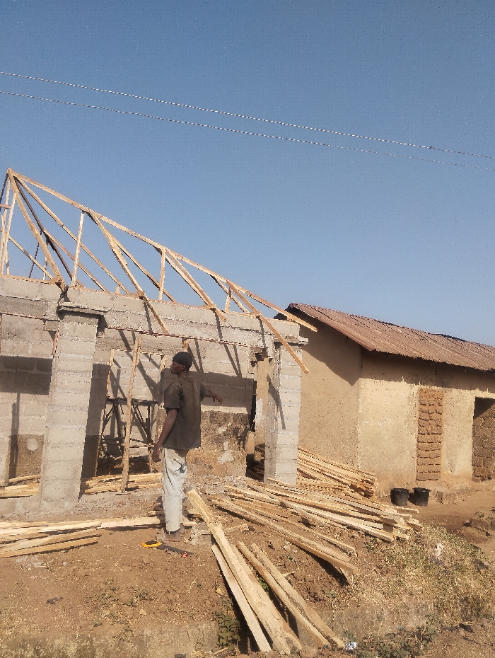 This image, taken in Unguwan Rimi, Nigeria, depicts an active construction site under a clear blue sky