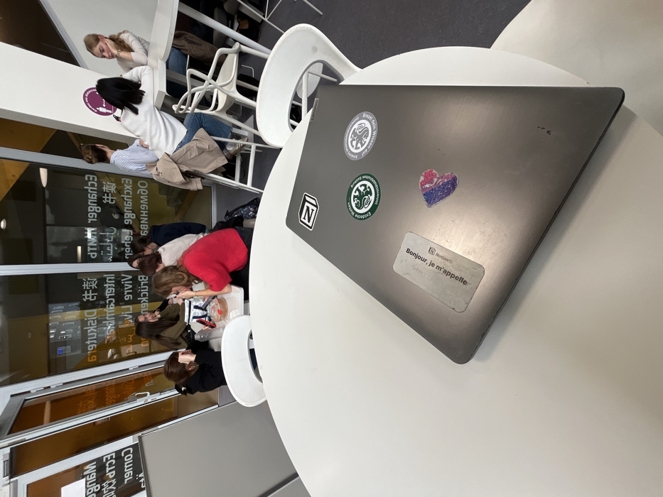 The image depicts an indoor scene within an educational institution in Roubaix, France, characterized by modern architecture and multiple groups of young adults. In the immediate foreground, a closed, dark gray Lenovo laptop rests on a round white table, partially obscuring a white chair. The laptop's lid features several stickers: a black and white rectangular "Z!" logo in the top left, two circular green and white stickers (one with text "Europäische Welten..." and a crest, the other with "Berlin Wissen" and a crest), a rectangular white sticker with "Bonjour, je m'appelle" and faded text below, and a glittery, heart-shaped sticker in blue and pink tones. Behind the foreground table, the space extends into a common area or lounge. To the left, a group of approximately five young women is seated around a smaller white table with white chairs. They are engaged in conversation, with some holding phones or items in their hands. A red container, possibly holding food, is visible on their table. One woman wears a red long-sleeved top. Further to the right, another group of two young women is seated at a tall, white bar-height table with matching tall white chairs. One woman, wearing a white sweater and jeans, faces left, while the other, with blonde hair, faces right and leans on her hand. A light brown coat is draped over the back of one chair. A purple circular sign with a "no standing close" icon is visible on a white pillar between the groups. The background features large, angled glass windows that reflect interior elements and display reversed text in multiple languages, including French ("Échanger", "Vivre", "Apprendre"), English ("Exchange", "Living"), German ("Diskutieren"), and Chinese characters, suggesting an international or multi-cultural environment within the facility. The architecture incorporates white walls and structural elements, with an orange-yellow section visible through the glass on the left. The floor is dark gray carpet.