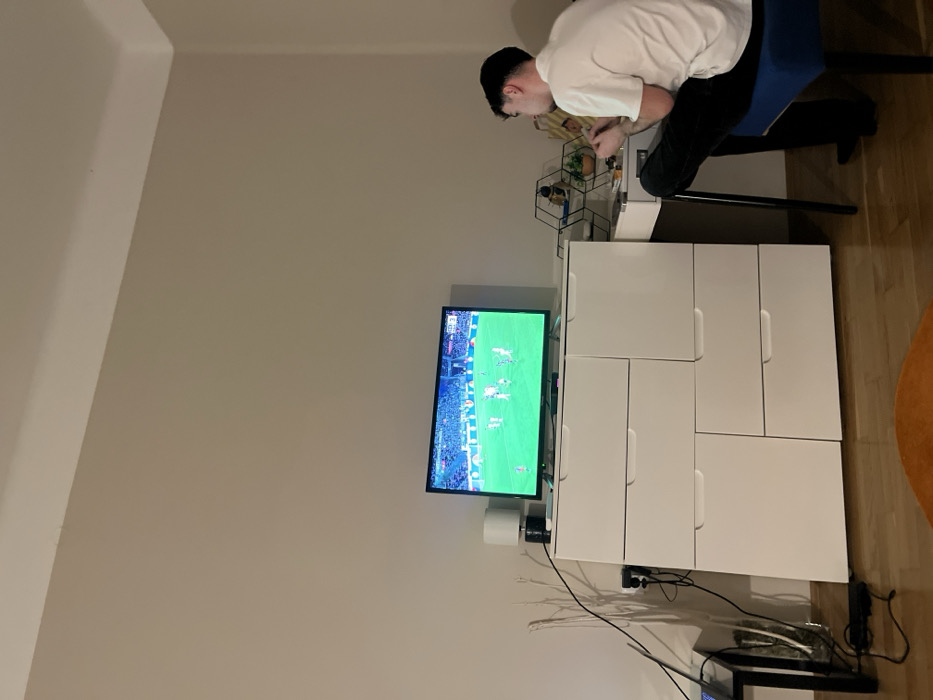 This image depicts an indoor scene, likely a residential living space or bedroom. The specific location within the city of Grad Rijeka, Croatia, cannot be determined from the visual information provided. In the foreground, a young adult male, appearing to be in his late teens or twenties, is seated on a blue upholstered stool with black legs. He has short dark hair, wears a black beanie, a light-colored (possibly white or cream) short-sleeved t-shirt, and dark trousers. He is positioned facing towards a television screen, with his right hand extended towards objects on a white desk to his right, possibly interacting with a device or item. A flat-screen television is centered on a white dresser, displaying what appears to be a live soccer or football match, with players on a green field and spectators in the background. The television screen shows a score or time indicator in the upper right. The dresser consists of six drawers, arranged in an asymmetrical pattern. To the left of the television, on the dresser, is a white cylindrical table lamp with a black base, emitting light. To the immediate left of the dresser, a black side table holds an open laptop and tangled black cables leading to a power strip on the floor. Several dried branches or decorative sticks are visible against the wall behind the side table. To the right of the seated individual, a white desk with a black metal frame holds various items, including a black hexagonal decorative shelf unit with small potted plants or similar decor. The room features light beige or taupe colored walls, a white ceiling with a visible crown molding, and light brown hardwood flooring. An orange, rounded object, possibly an ottoman or cushion, is partially visible in the bottom center foreground. The lighting in the room appears to be from internal sources, creating soft illumination.