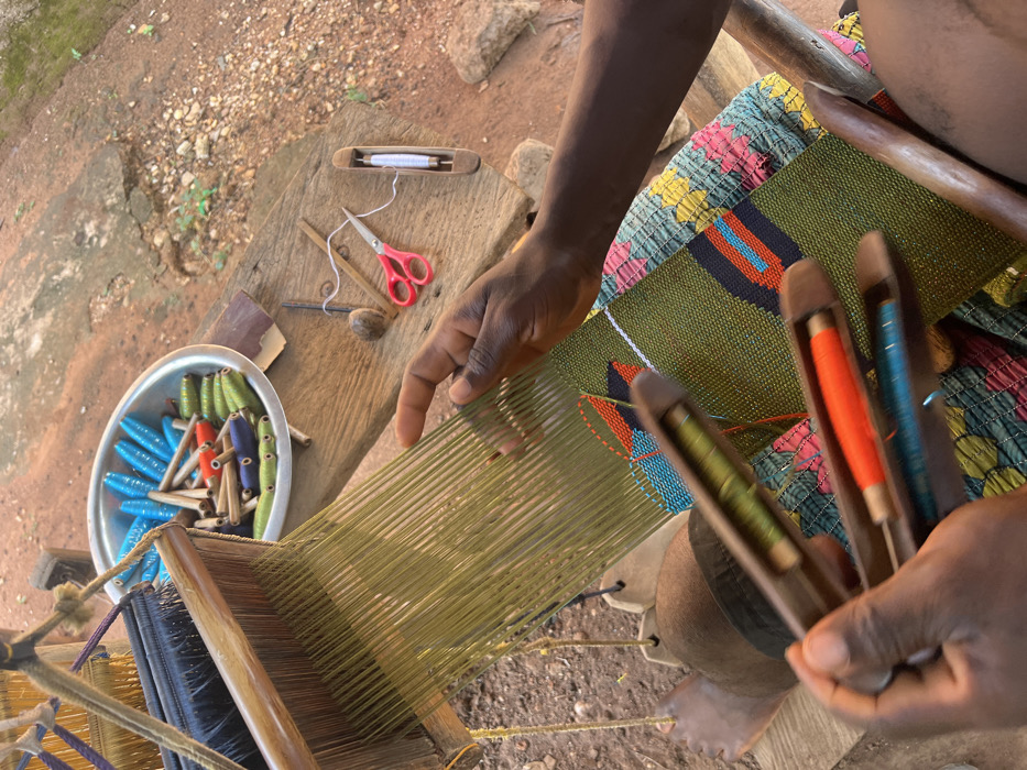 An overhead view captures a dark-skinned individual engaged in handloom weaving in Wuinta, Ghana