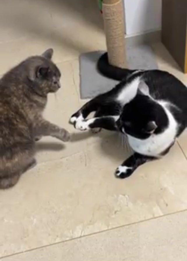 two cats on a light tan tile floor. One is a gray tortoiseshell cat sitting upright and the other is a black and white cat lying on its side. The tortoiseshell cat extends a paw toward the black and white cat and makes contact with the other cat’s paw. Behind the cats is a beige scratching post with a small square gray base. A beige wall and corner are visible in the background.