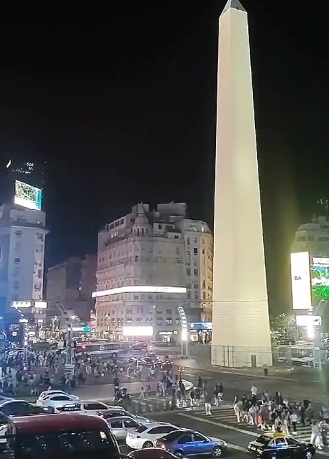 nighttime scene of a bustling city square, likely in Argentina, dominated by a tall, white obelisk, brightly illuminated