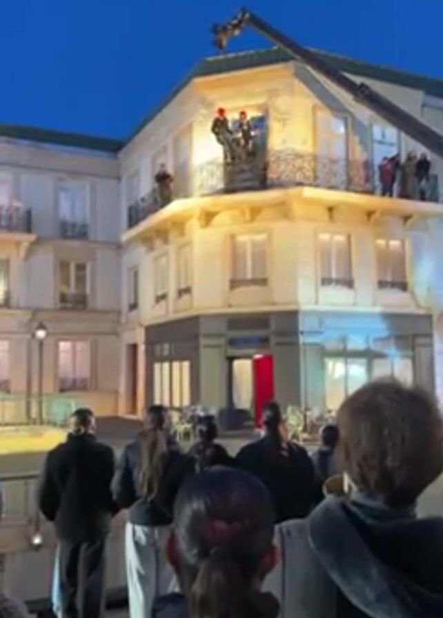 stunt involving two people performing on a set resembling a European street scene at night. The backdrop includes buildings with balconies. Two individuals, wearing dark clothing and red helmets, are connected to wires and are performing a stunt. One person is thrown off a balcony while the other pulls the first one up using the wires, creating an aerial effect. A group of people are standing below, watching and recording the stunt. A crane with a camera is visible in the background, suggesting the scene is being filmed professionally. The sky is dark blue, indicating it is dusk or night. The overall impression is that this is a scene from a movie or theatrical performance.