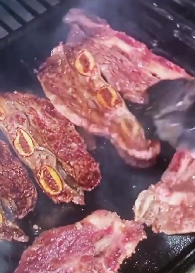A first-person, close-up shot shows metal tongs flipping pieces of raw meat, some containing bone fragments, that are cooking on a black grill top. Smoke is rising from the meat as it cooks. The grill has thin metal slats running horizontally.