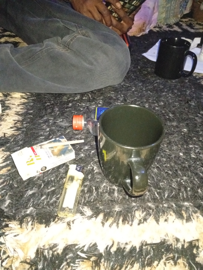 The scene is set indoors in Sabon Tasha, Nigeria, on a dark, shaggy rug with interspersed light-colored fibers. A person's lower torso and dark-toned hands are visible in the upper left, the individual wearing dark gray corduroy trousers and seated on the rug. In the foreground, an open white cigarette pack labeled "R.J. Gold" contains a single cigarette partially extended. Adjacent to the pack is a clear plastic disposable lighter. Centered in the midground is a dark green ceramic mug with a handle and a yellow marking on its side. To the left of this mug lies a clear plastic bottle with an orange cap, showing a blue label. In the upper right background, a black ceramic mug filled with a dark liquid rests on a white paper or napkin. No direct actions or interactions are depicted.