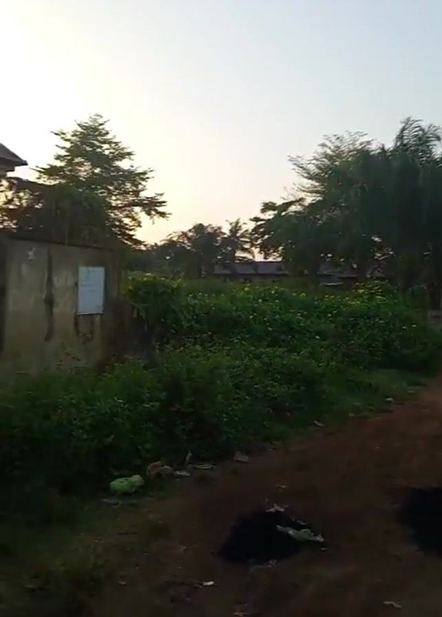 The video depicts a dirt road in a residential area, likely rural or suburban, possibly in Nigeria, given the narrator mentions “Care Free Natural State”. The area is characterized by a mix of overgrown vegetation, concrete walls, and buildings with corrugated iron roofs. The camera pans across the scene, capturing details such as piles of dark material on the ground and utility poles with wires running overhead. The sky is visible in the background, suggesting an early morning or late afternoon lighting. There are no visible people or animals.