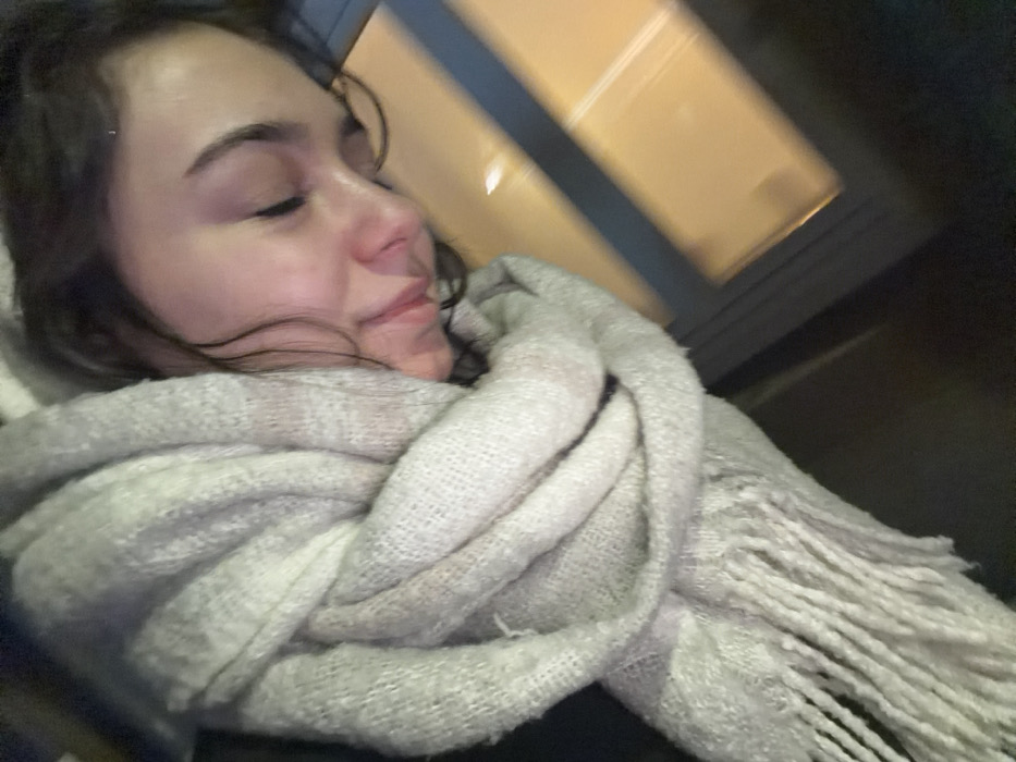 A woman rests, enveloped in a chunky, light-colored knit scarf with fringed edges