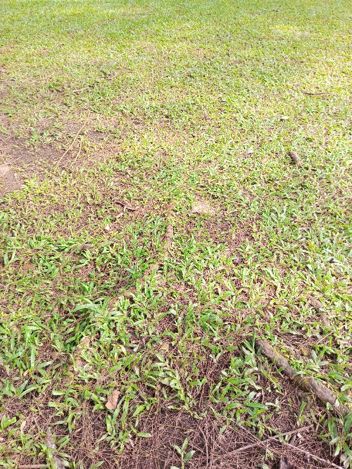 A ground-level image taken in New Serchhip, India, depicts an expanse of natural terrain. The scene is dominated by a patchy cover of short, light green grass, interspersed with visible areas of dark brown soil and dried organic matter. The dried matter consists of numerous brown, needle-like fragments and withered leaves, particularly concentrated in the lower half of the frame. Several small, dark brown, gnarled stick-like objects or exposed roots are present, notably near the lower right edge and scattered elsewhere. No individuals, animals, or man-made structures are observed. The environment appears to be an outdoor, uncultivated area, illuminated by natural light.