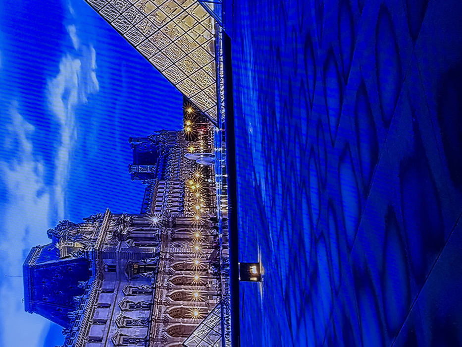 The image depicts a nighttime exterior scene in Madzherito, Bulgaria. A grand, multi-story classical building with an ornate facade, featuring numerous arched windows, columns, and a prominent mansard roof, occupies the left and background. This structure is brightly illuminated with warm yellow light emanating from its windows and exterior architectural features. To the right, a large, glowing glass pyramid, characterized by its geometric paneled structure, rises prominently, also emitting a warm, golden light. In the midground, an illuminated plaza area features multiple artificial light sources, including rows of streetlights with warm yellow glows and at least one active water fountain with illuminated water jets. Several indistinct figures of people are present in this area, suggesting public activity. The foreground consists of a vast paved surface, primarily bathed in deep blue light, which creates a distinct tessellated pattern of lighter blue shapes on the ground. A single small, dark, rectangular object, possibly a lantern or a ground light, emits a faint warm glow in the lower-middle portion of the frame. The sky overhead is dark blue with subtle cloud formations.
