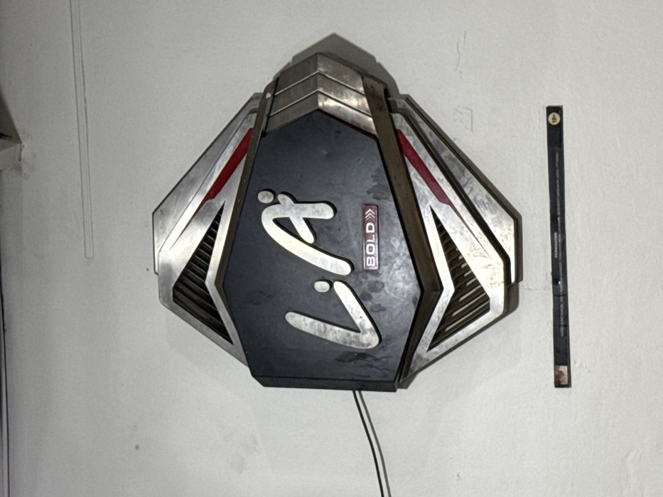 The image displays a wall-mounted sign against a white, slightly textured wall, located in Lhokseumawe, Indonesia. The central subject is an irregularly shaped, stylized octagonal sign, which features a dark gray or black central panel. Prominently displayed on this panel are the silver-colored script letters "LA", with a smaller rectangular white box beneath them containing the word "BOLD" followed by two right-pointing chevrons (">>"). The outer structure of the sign is composed of metallic silver-gray elements with segmented lines and subtle red accent stripes. Two black electrical wires extend from the left side of the sign. Positioned horizontally below the main sign, a thin, dark rectangular strip is affixed to the wall. This strip contains text, including "PERINGATAN" (Indonesian for "WARNING") and an "18+" age restriction symbol visible on the far right. The wall exhibits minor smudges and marks. No individuals, actions, or specific interactions are depicted.