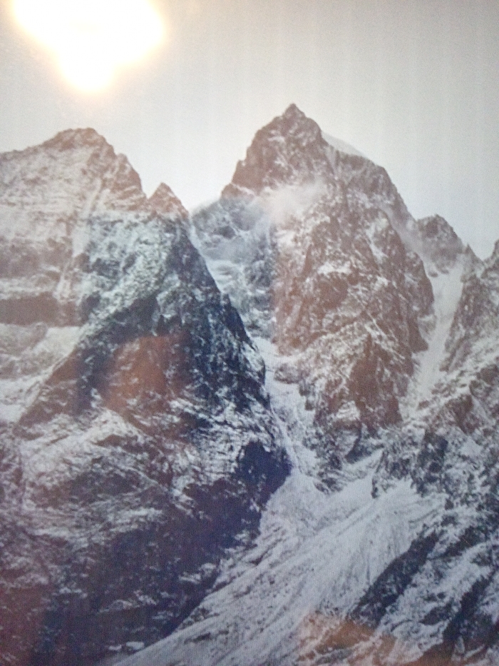 The image displays a vast mountainous landscape under a bright, overcast sky with a prominent, luminous light source in the upper-left quadrant