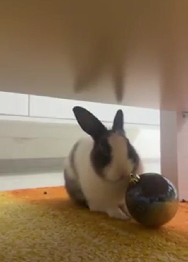 small rabbit on a yellow and orange patterned rug, under a white table or shelf. The rabbit is predominantly white with dark fur around its eyes and on its ears and back. A large, dark-colored, shiny Christmas ornament is sitting in front of the rabbit on the rug. The rabbit appears to be sniffing or nudging the ornament with its nose. The overall lighting is bright.