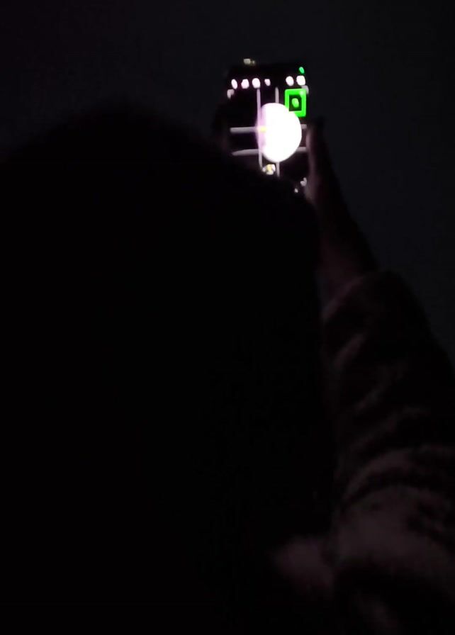 A person is holding a smartphone, taking a picture of the moon at night. The moon is visible on the phone's screen, which has a digital interface with camera settings. The surrounding environment is dark, with some indistinct objects or surroundings visible. The person's body is mostly silhouetted against the dark background.