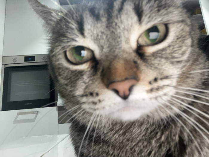 - "The image presents a close-up, head-on view of a domestic tabby cat, situated within a residential kitchen in Izhevsk, Russia" by FM-mWrWX2, licensed under CC BY 4.0