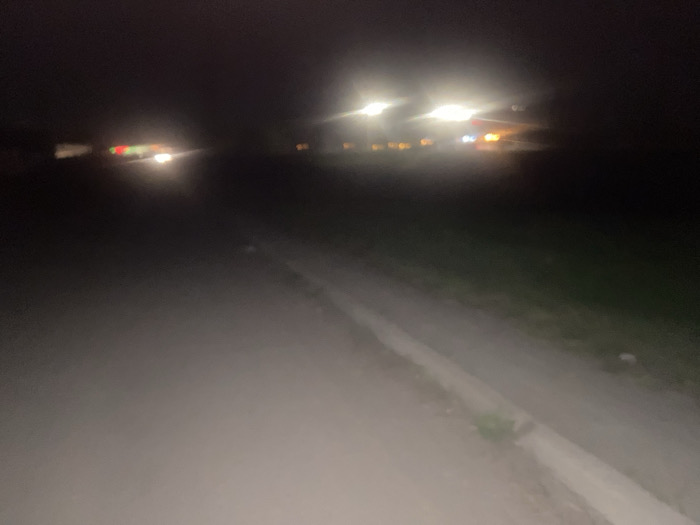 The image is a nighttime shot of a paved road in Mykolaiv, Ukraine, near the intersection of Kostiantynivska Street and Mykolaivska Street. The road is straight and appears to be empty, with only a single streetlight illuminating the road. On the right side of the road is a concrete curb, and there is some grass growing on the edge of the road. The image is blurry due to the darkness and the use of a camera flash, but it is possible to make out the shape of a vehicle in the distance. There are no people visible in the image. The image is likely taken from a moving car, as the perspective appears to be slightly tilted forward.