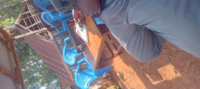 A close-up shot, slightly tilted, reveals blue plastic chairs placed beneath a dilapidated wooden structure