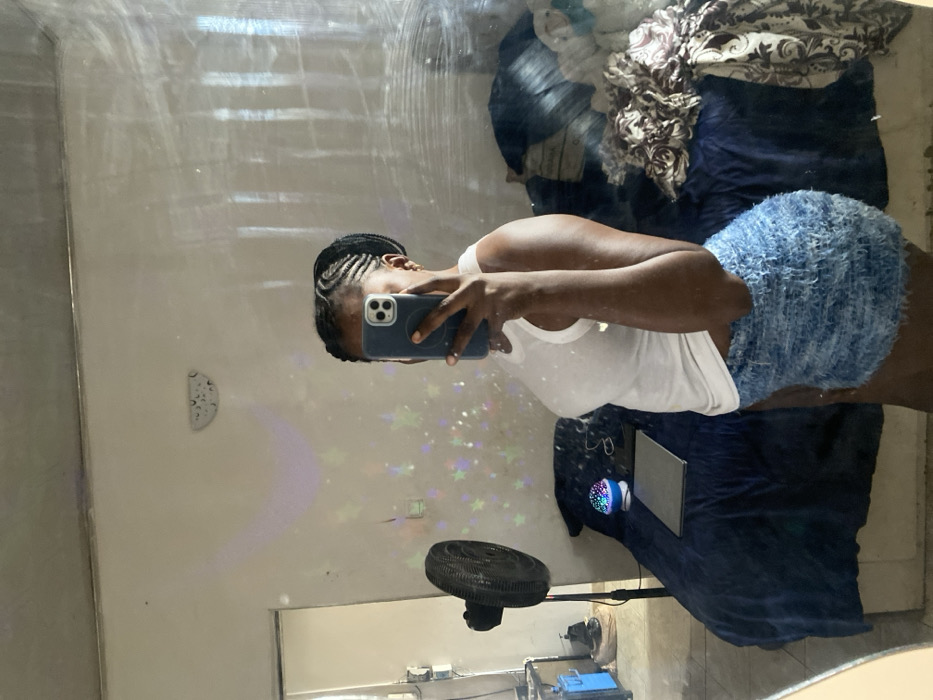 A forensic description of the scene reveals an individual of dark complexion taking a mirror selfie in what appears to be a bedroom in Sabon Tasha, Nigeria. The individual, dressed in a white sleeveless top and a light blue, textured mini-skirt, holds a dark-colored smartphone, obscuring their face. Their hair is styled in cornrows, and a small gold hoop earring is visible in their right ear. The reflection in the mirror shows a room with light-colored, somewhat worn walls. A bed covered with a dark blue blanket occupies the center, on which a closed silver-backed laptop or tablet and a small, spherical, multi-colored LED light projector are present. Projected star and moon patterns from this device are visible on the wall behind the bed. To the left, a black standing fan is positioned. Further left, electrical conduits or wiring are visible on the wall, along with a partial view of a doorframe. A decorative, half-moon shaped object with cutouts adorns the wall above the bed. To the right of the bed, a pile of assorted clothing or fabric, including items with floral or paisley patterns, is visible. The floor appears to be concrete or tiled.