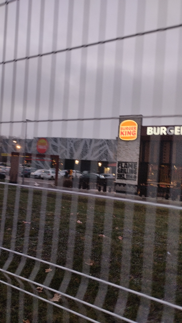The image presents an outdoor commercial environment in Hœnheim, France, observed through a wire mesh fence. The scene is under an overcast sky with dim ambient lighting. In the immediate foreground, a blurred wire fence with vertical and horizontal elements obstructs the view. Through the fence, a patch of green grass is visible, scattered with brown autumn leaves. The midground features an asphalt parking lot with multiple vehicles. At least two light-colored cars are discernible, along with several darker vehicles. Artificial lights from poles illuminate sections of the parking area. In the background, two commercial buildings are prominent. To the right, a Burger King restaurant displays its illuminated orange and white circular logo on a tall pylon, alongside partially visible text that includes "FLAME GRILLING SINCE 1954." The building itself has a dark facade with large windows. To the left, an adjacent building, identified as a Buffalo Grill by its circular red and white logo (featuring a stylized buffalo head), exhibits a distinctive patterned facade with an intricate geometric design. No specific individuals or active interactions are clearly visible within the frame.