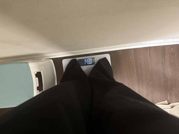 person standing on a white digital scale. The display reads "148.0". The person is wearing black pants, and their feet are visible on the scale. To the left of the scale, partially visible, is a light blue and white exercise step. The scale is placed on a brown wooden floor, positioned near a white wall with a subtle trim.