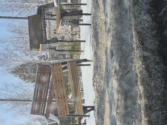 The image depicts an outdoor urban scene in Kambarka, Russia, during winter. In the foreground, a substantial mound of dirty, granular snow and ice occupies the lower half of the frame, showing signs of dirt accumulation and partial melting. Directly behind this, the midground features two distinct sets of public seating. To the left, a multi-tiered wooden bench, dark brown in color, is angled upwards on a dark metal frame, partially covered in white snow. To the right, another wooden bench with matching dark brown slats stands on ornate black metal legs featuring intricate cut-out patterns. Adjacent to this bench on its right is a small, rectangular wooden table, also supported by identical ornate black metal legs. Both the right bench and table are situated on a surface covered with clean, white snow. The background reveals numerous bare deciduous trees, primarily birches, interspersed with some coniferous trees, set against a clear, bright blue sky. Vertical grey poles are also visible. Distant structures, likely buildings, are faintly discernible through the tree line. No individuals or active events are present in the scene.