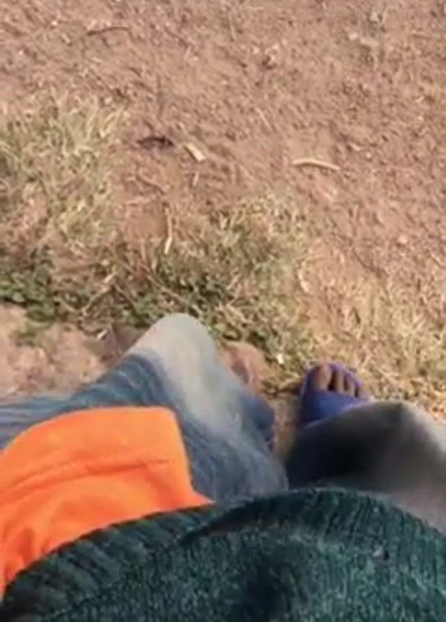 first-person perspective of someone walking on dirt and grass. The person is wearing blue jeans, blue sandals, an orange shirt, and a dark green sweater. The ground is mostly dirt with some small patches of grass and twigs.