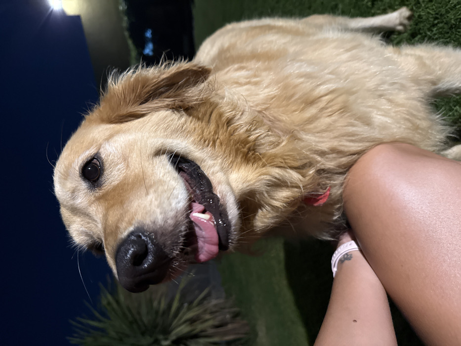 A golden retriever lies on grass with its head tilted towards the camera. The dog's mouth is slightly open, revealing its pink tongue and dark gums. A dark blue sky is visible in the background, indicating it is likely nighttime. A person's legs with a white watch are visible on the right side of the image, near the dog's fur. The dog's fur is golden brown, with slight variations in color.