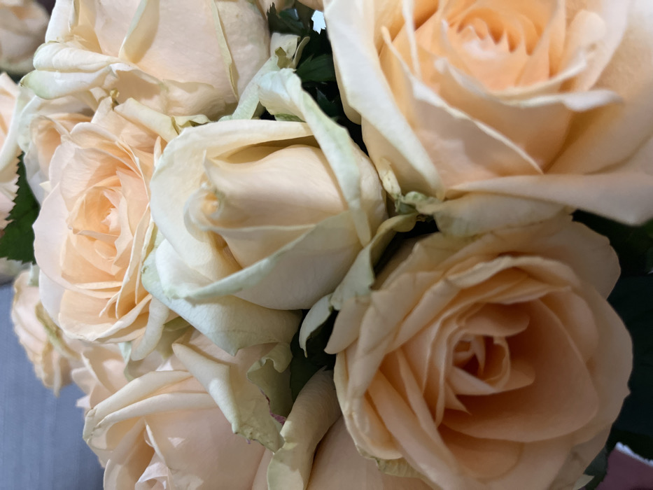 - "A cluster of light peach-colored roses fills the frame" by FM-ocCcw2, licensed under CC BY 4.0