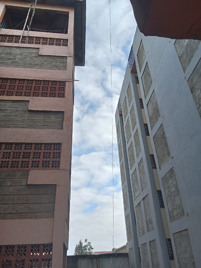 Two buildings frame a sky filled with clouds. The left building is pink with brick and concrete features. The right building is tall and gray, with a repeating pattern of windows and concrete panels. A thin wire stretches vertically between the buildings. Below, vegetation and rooftops appear in the distance. The perspective is angled upward, emphasizing the height of the structures.