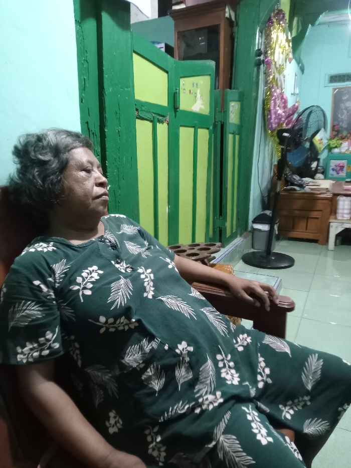 A female individual is seated indoors in a domestic setting, located in the city of Kecamatan Pati, Indonesia