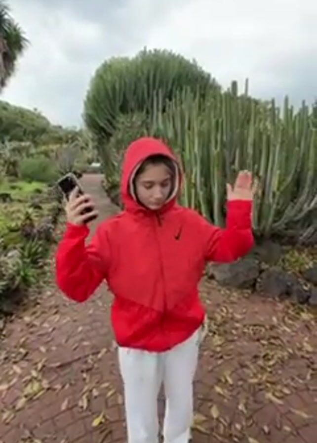 In the video, a young girl is standing on a red brick pathway in what appears to be a garden or park. She is wearing a bright red Nike jacket with the hood up, white pants, and white sneakers. She is holding a smartphone in her left hand. Her arms are raised and she appears to be dancing or moving to music that is playing. Behind her are various plants and cacti, including tall, vertical cacti. The sky is overcast.