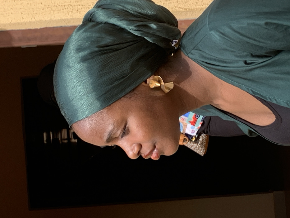 This image depicts a young individual, likely female, in a left-facing profile, situated in Apata Yakuba, Nigeria. The subject wears a dark green, textured headscarf, covering the hair and ears, and a matching dark green outer garment over a black inner top. A large, abstract, gold-toned earring is visible on her right earlobe. Her lips are slightly parted. The background directly behind the subject is a dark, recessed area, consistent with an open doorway or entrance, showing vertical light reflections within. To the subject's left, partially obscured, is an object featuring colorful patterned fabric and a woven texture, possibly a bag or part of another person. The background to the subject's right is a light brown, textured wall. The scene is illuminated by strong, directional light, casting highlights on the subject and the adjacent wall.