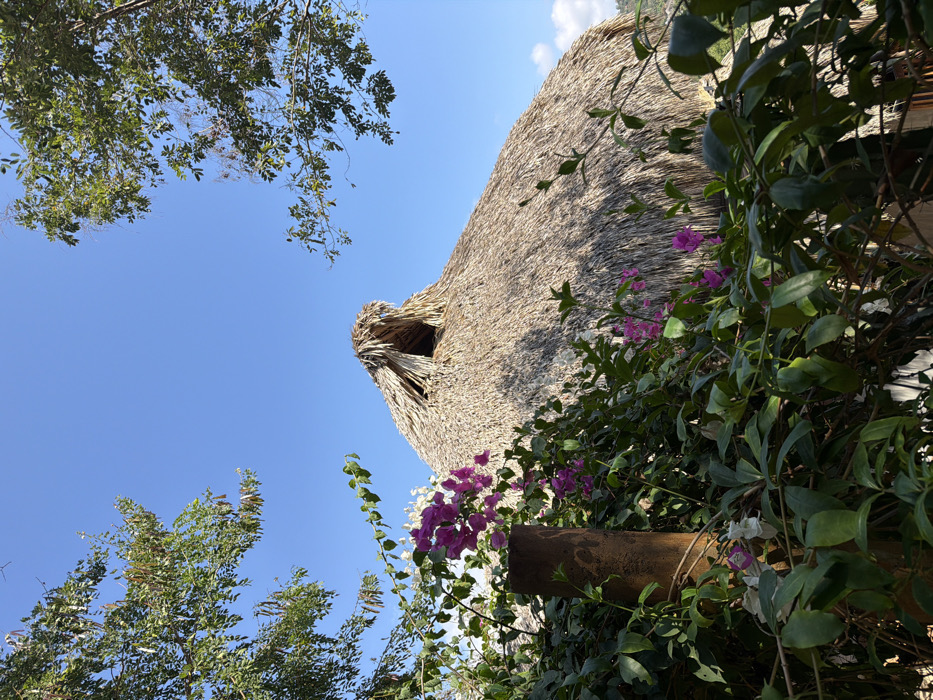 The low-angle shot features a traditional thatched roof structure, possibly a palapa, against a clear blue sky. The roof is made of dried palm leaves, showing a small opening near the top. Lush greenery, including flowering vines with purple and white blossoms, spills over a wooden post on the right side. Trees with green foliage frame the upper and lower left corners. The light is bright, suggesting a sunny day.
