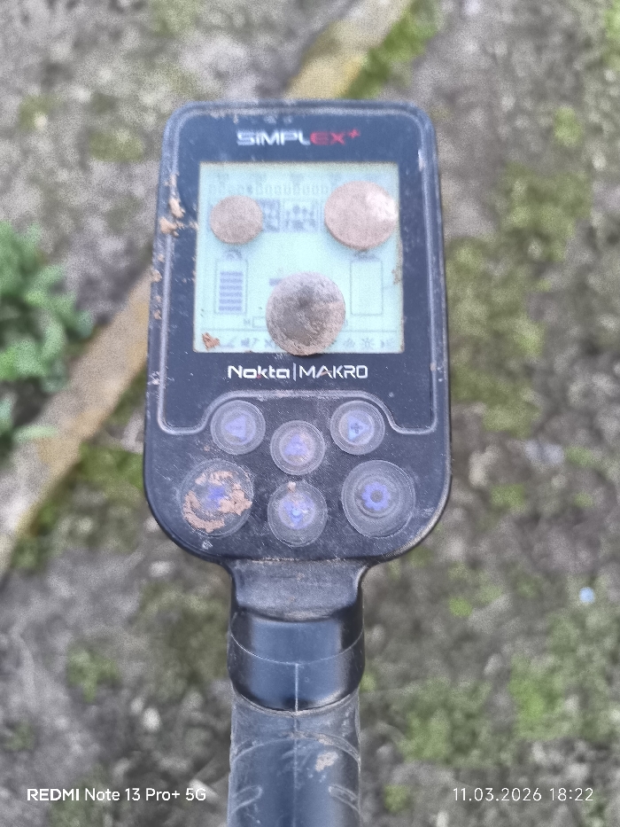 A black Nokta Makro SIMPLEX+ metal detector is depicted outdoors in Dolni Dabnik, Bulgaria, viewed from a slightly elevated perspective. Three circular, soil-encrusted metal objects, consistent with weathered coins, are resting directly on the illuminated LCD screen of the device. The screen displays digital indicators, including a battery icon and numerical values, partially obscured by the objects and residual dirt. Below the screen, the control unit features six circular, translucent button covers, some of which exhibit accumulated soil. The upper section of the metal detector's black shaft extends downwards from the control unit. The background consists of blurred, textured ground composed of brown soil with scattered patches of green vegetation and a lighter, linear ground feature in the upper left. The device and the objects on its screen are covered with soil, indicating recent excavation activity. No human figures are present. The image was captured on 11.03.2026 at 18:22 using a REDMI Note 13 Pro+ 5G.