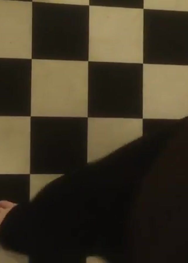 person standing on a black and white checkerboard floor. The person is wearing black pants. The person takes a step forward with their bare feet. Then, the person appears to be holding a blue and white object.
