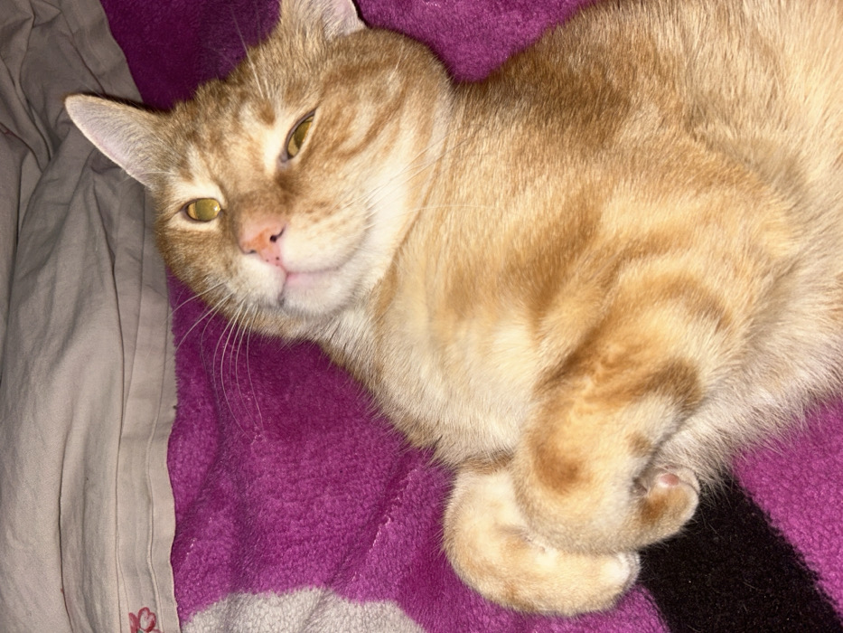 - "An orange tabby cat rests on a purple blanket with a white and black stripe" by FM-ZvYlO2, licensed under CC BY 4.0