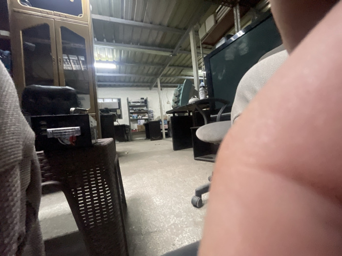 An indoor shot shows a cluttered space, likely a warehouse or storage area. A tall, dark cabinet stands to the left, with a black chair in front. To the right, a desk with a large monitor and an office chair are visible, partially obscured by a large blurry object in the foreground. Other furniture and equipment are scattered in the background, including shelving and dark storage containers. The lighting is dim, and the overall impression is of a disorganized, functional space.