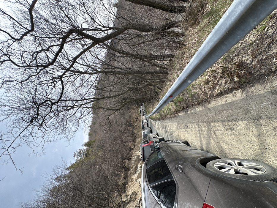 The image depicts a rural road scene in Karnare, Bulgaria, under a clear, bright sky. A line of approximately ten or more vehicles, including SUVs and passenger cars, is stopped or parked in a queue along the left side of an unpaved, dusty road. The closest vehicle, a dark-colored SUV, is seen from its rear driver's side, showing visible dirt on its body and wheels. To the right of the road, a silver metal guardrail with occasional red reflectors runs parallel to the vehicle queue. Beyond the guardrail, a dense collection of bare-branched deciduous trees descends into a valley or ravine, partially obscuring a body of water or distant terrain. The hillsides on both sides of the road are heavily forested with mostly bare trees, indicating late winter or early spring conditions, though some evergreen foliage is visible on higher slopes. No individuals are visible.