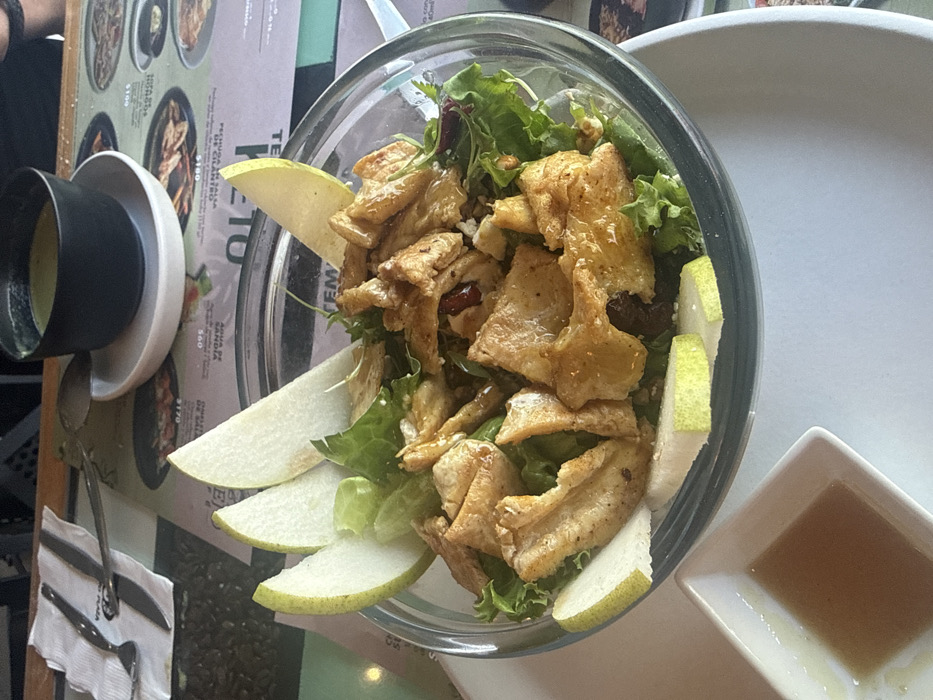 A glass bowl contains a salad with mixed greens, slices of green pears, and seasoned croutons. Next to the salad is a small, square white bowl holding dressing. A black bowl sitting on a white plate and utensils are visible in the background. The salad rests on a white surface, with a menu and a plate out of focus in the periphery.