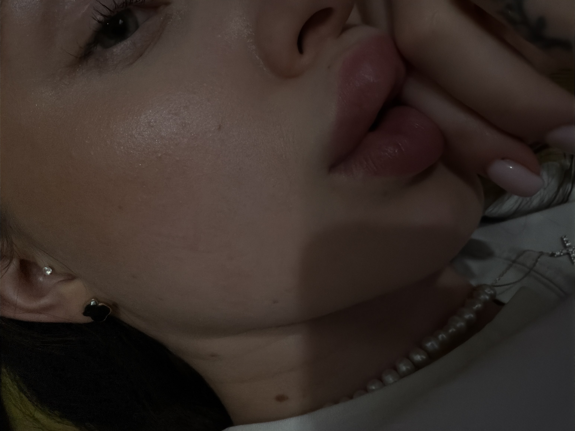 A close-up, angled shot depicts a woman's face, positioned with her nose and mouth centered. Her right hand is partially obscuring her mouth. Her eye is visible on the upper left side of the frame. She has light skin and her lips are slightly parted. She is wearing a pearl necklace. Her ear is visible on the lower left side of the frame, adorned with a black heart-shaped earring and a small stud earring above. A tattoo is partly visible on the upper right. The location is Воскресенские Усадьбы Кп, Russia.