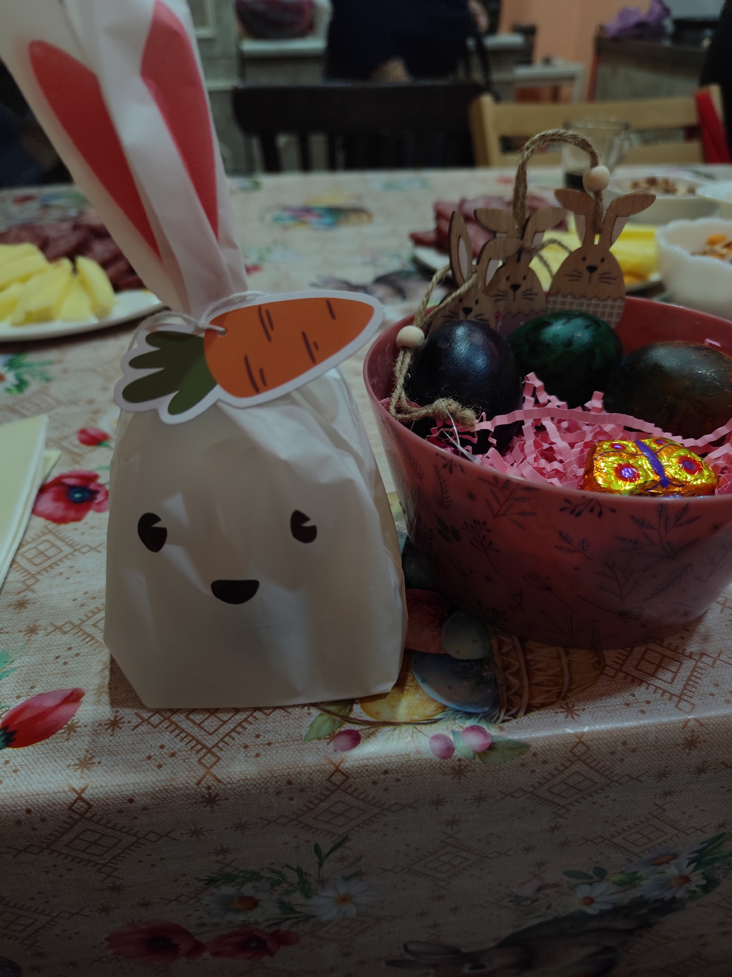 n Easter table setting, likely indoors. A white paper bag with a simple drawn face and a carrot tag is positioned next to a pink bowl containing Easter eggs of various colors (black, green, brown) and a chocolate candy wrapped in gold foil with a purple butterfly design. The bowl is filled with pink paper shred. Three wooden rabbit ornaments hang from the edge of the bowl. Behind the bowl and bag are plates of food, including cheese and sausage. The table is covered with a floral patterned tablecloth. The setting is suggestive of an Easter celebration, but the location, Vratsa, Bulgaria, is not evident from the image.