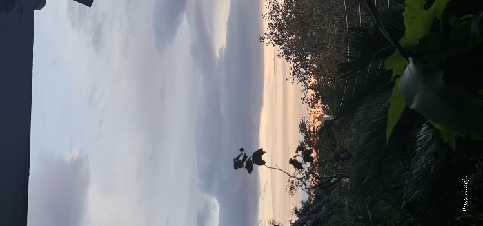 A cloudy sky with hues of orange is partially obscured by silhouetted leaves and branches. The right side features denser foliage, adding depth to the view. The overall impression is a serene, nature-filled scene, captured during dawn or dusk.