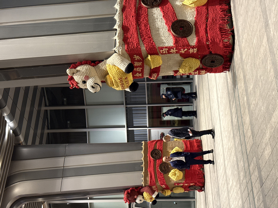 The image depicts a modern indoor commercial or public space, likely an atrium or large lobby, in Changping District, China. The floor is covered with light-toned rectangular tiles. Tall, grey, vertical architectural columns delineate the space. Two large, elaborate sculptures, constructed from red, white, and yellow knitted or crocheted materials, dominate the foreground. Each sculpture features a white knitted horse figure with a red mane and tail atop a cylindrical base. The horses hold yellow knitted objects, with "ONGDE PLAZA" and "2026" visible on the object held by the right horse. The bases are decorated with horizontal stripes, fringes, replica ancient Chinese circular coins, and yellow knitted gold ingots (yuanbao). Chinese characters are visible on the red sections of the sculptures, including "金马贺岁" (Golden Horse Celebrates the New Year) and "马年大吉" (Good Luck in the Year of the Horse). In the mid-ground, two adult males in dark business suits are conversing. The man on the left, bald, faces the man on the right, who holds a white paper or tablet. Further in the background, to the right, two uniformed individuals, likely security personnel, stand near a glass partition. One appears to hold a dark shield or piece of equipment. Through the glass behind them, a white Tesla vehicle and a charging station are partially visible. The background also reveals tall glass panels reflecting portions of the interior.