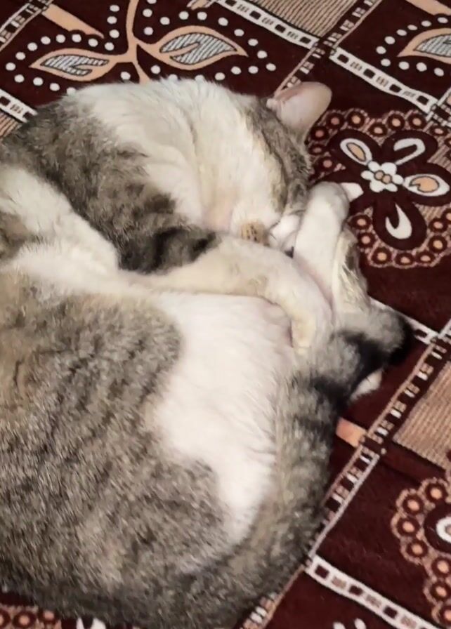 - "A video depicts a gray and white cat sleeping curled up on a bed with a dark red patterned bedspread" by FM-UCF3H3, licensed under CC BY 4.0