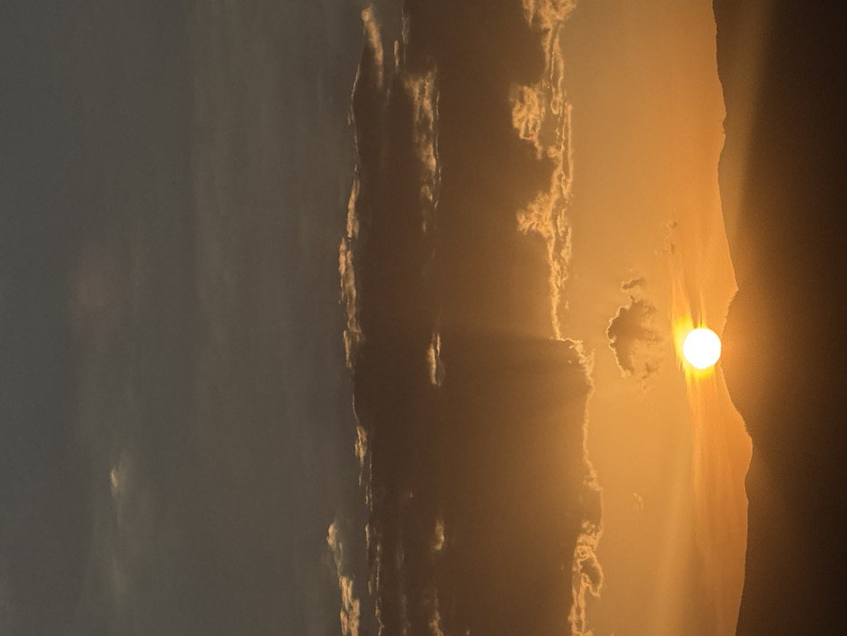 An outdoor landscape photograph captured in San Francisco Ocotlán (Ocotlán), Mexico, depicts a sunset or sunrise event. The scene is dominated by a sky transitioning from dark gray in the upper portion to a vibrant orange and yellow hue towards the horizon. A prominent, intensely bright white-yellow sun orb is positioned just above the silhouetted peaks of a mountain range that spans the lower section of the image. Multiple layers of clouds are visible: dark, scattered clouds occupy the upper sky; a denser band of dark clouds with illuminated orange edges extends across the mid-section, from which distinct crepuscular rays descend towards the left-center; and lighter, glowing orange clouds are present closer to the horizon, partially obscuring the sun. The mountains are rendered as an indistinct, dark silhouette against the brightly lit lower sky. No human subjects, man-made structures, or overt actions are present.