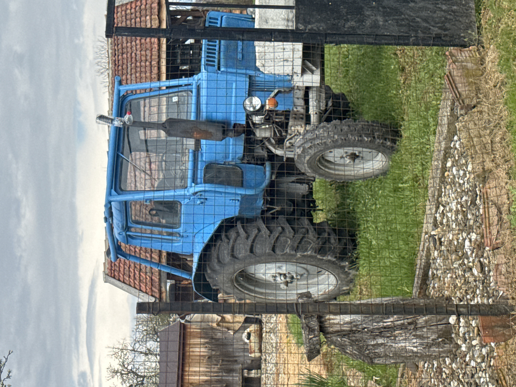 A blue tractor is parked behind a metal wire fence. The tractor's front wheel is in the upper right of the frame. A small building with a brown roof is visible in the background, behind the tractor's cab. A section of metal fencing with stones and dirt behind it is in the lower right. Another small building is in the lower left of the frame. The sky is visible above the buildings. Location: Tutrakantsi, Bulgaria.