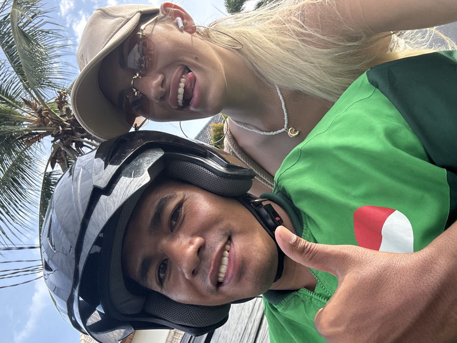 In Tibubeneng, Indonesia, an outdoor image captures a male and a female, likely on a motorbike. The male, positioned in the foreground and to the left, is wearing a black motorcycle helmet and a green jacket with a prominent red and white emblem on the chest. He smiles and presents a thumbs-up with his right hand. The female, situated behind and to the right, has blonde hair, wears a light-colored baseball cap, rimless sunglasses with reddish lenses, large hoop earrings, white wireless earbuds, and a white beaded necklace with a golden crescent moon pendant. She is smiling broadly with her tongue slightly extended. The background features green palm fronds, a palm tree bearing coconuts, a light blue sky with some cloud cover, and a section of a building with a dark tiled roof.