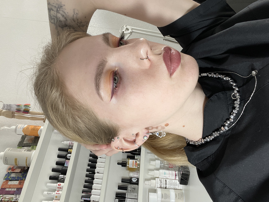 The scene is an interior location in Izhevsk, Russia. A light-haired individual is depicted from the chest up, in a profile view, facing right. The subject's left hand is raised, with fingers positioned near the left ear. The individual wears a black collared garment. The left ear features multiple silver-toned piercings and a hoop earring with a silver Hamsa hand charm containing a blue 'evil eye' motif. A small silver hoop piercing is present in the left nostril. Two silver-toned necklaces are worn: one composed of irregular, faceted beads and a second, thinner chain with a small, round pendant. A black ink tattoo is visible on the upper left arm/shoulder area. The subject's eyes are made up with orange eyeshadow on the lid, dark purple winged eyeliner, and reddish-pink shadow under the lower lash line. The lips are covered in a glossy reddish-brown substance. The background consists of a white wall fitted with several white shelves. These shelves are stocked with numerous bottles, jars, and spray containers, indicative of cosmetic or nail care products. Visible items include bottles labeled "BIODERMA" and "NOCTURNE," as well as containers with Russian text, some specifying "GEL-OFF" and "SPA SYSTEM." A small wooden artist's mannequin stands on an upper shelf, and a ring of nail polish color swatches hangs nearby. A portion of a white articulated lamp is visible on the far right side of the frame.