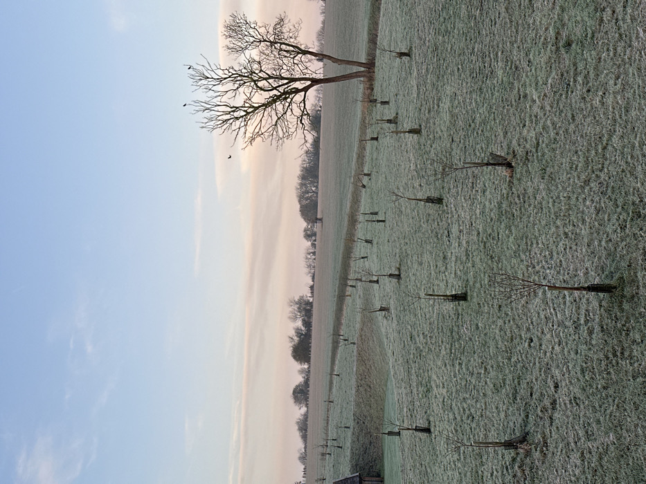 A frosty field slopes upward, dotted with rows of young trees in protective sleeves