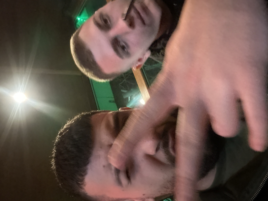 The image depicts two young adult males in an indoor, dimly lit setting, likely a bar or similar establishment, indicated by the low light and ambient green illumination in the background